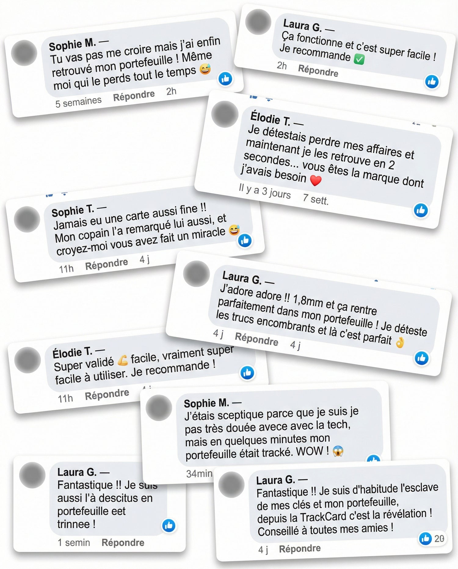 Oriane F. Jan 2026Client vérifiéJe recommande à tout mon entourageMon mari perd ses affaires tout le temps. Je lui ai offert la Trackcard, depuis plus de stress le matin.Cela vous a-t-il été utile ? 0 0